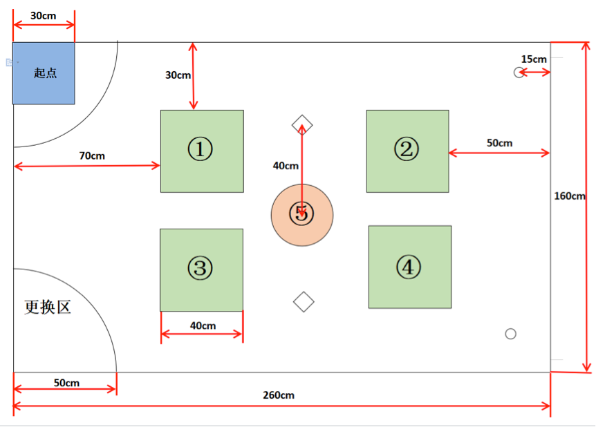 (2)机器人起点出发尺寸大小不超过30cm*30cm*30cm(出发后超尺寸不违规),其余机械臂等更换材料大小无要求但需摆放在更换区内,高度不限。